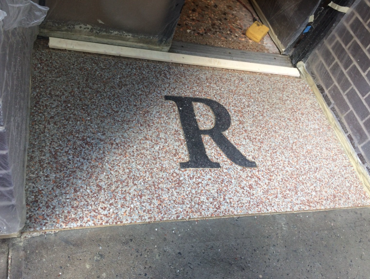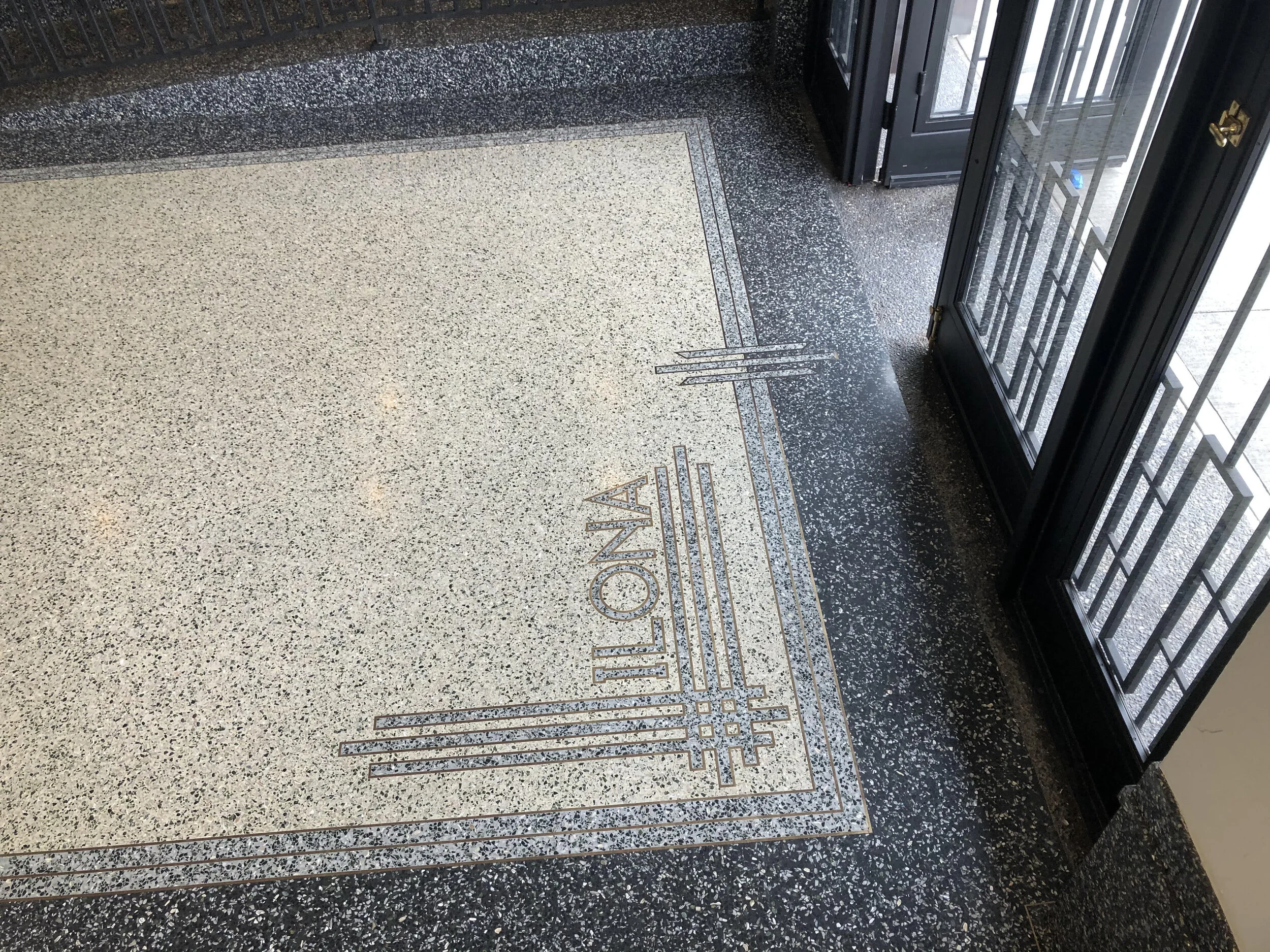 Custom terrazzo lobby floor with name spelled in terrazzo in Greenpoint New  York